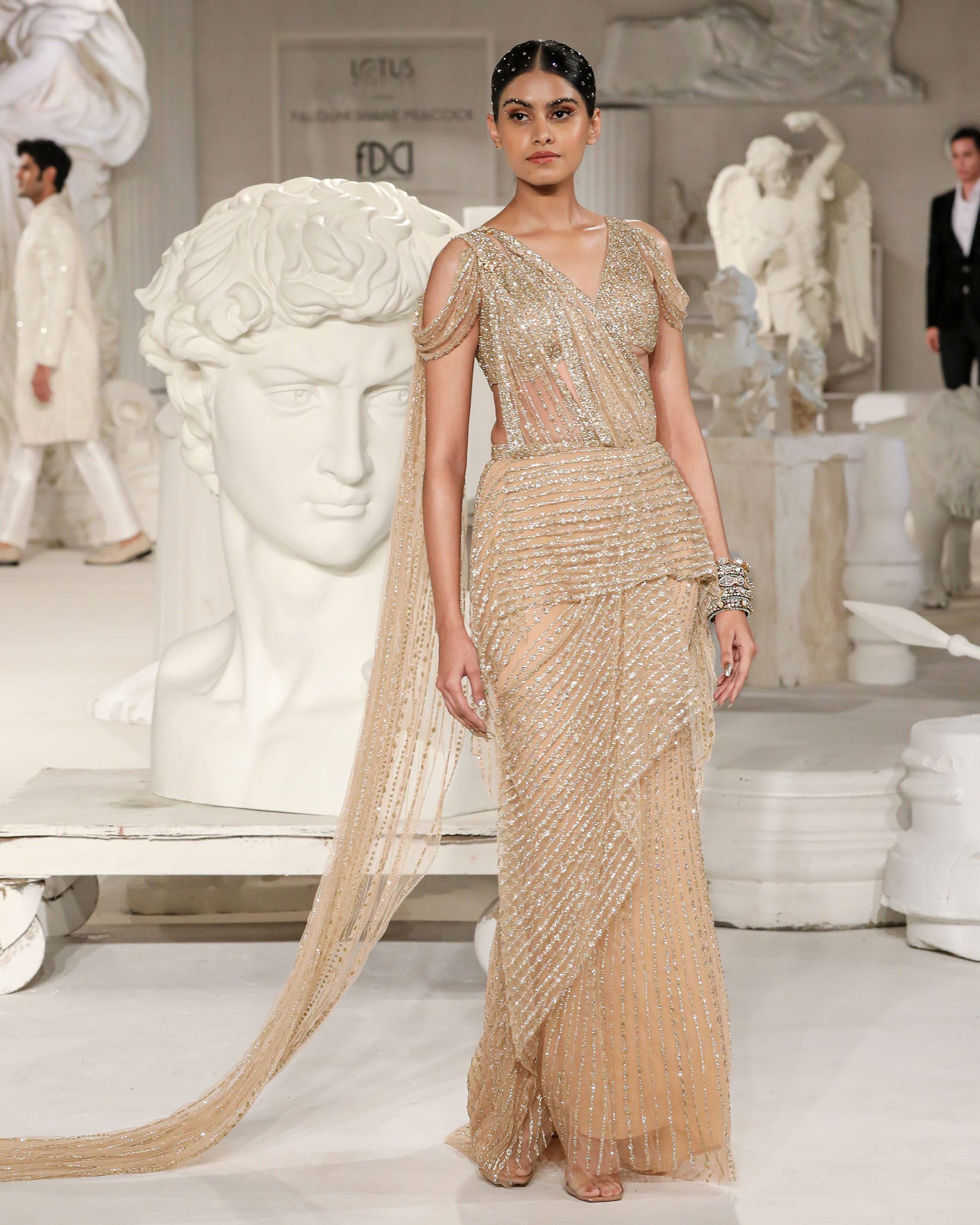 - Look: If you want to go the traditional saree draping route, stick to the usual nivi and other traditional and regional styles. For a fusion saree look, try belted pants, cape, or dhoti-style drape.
