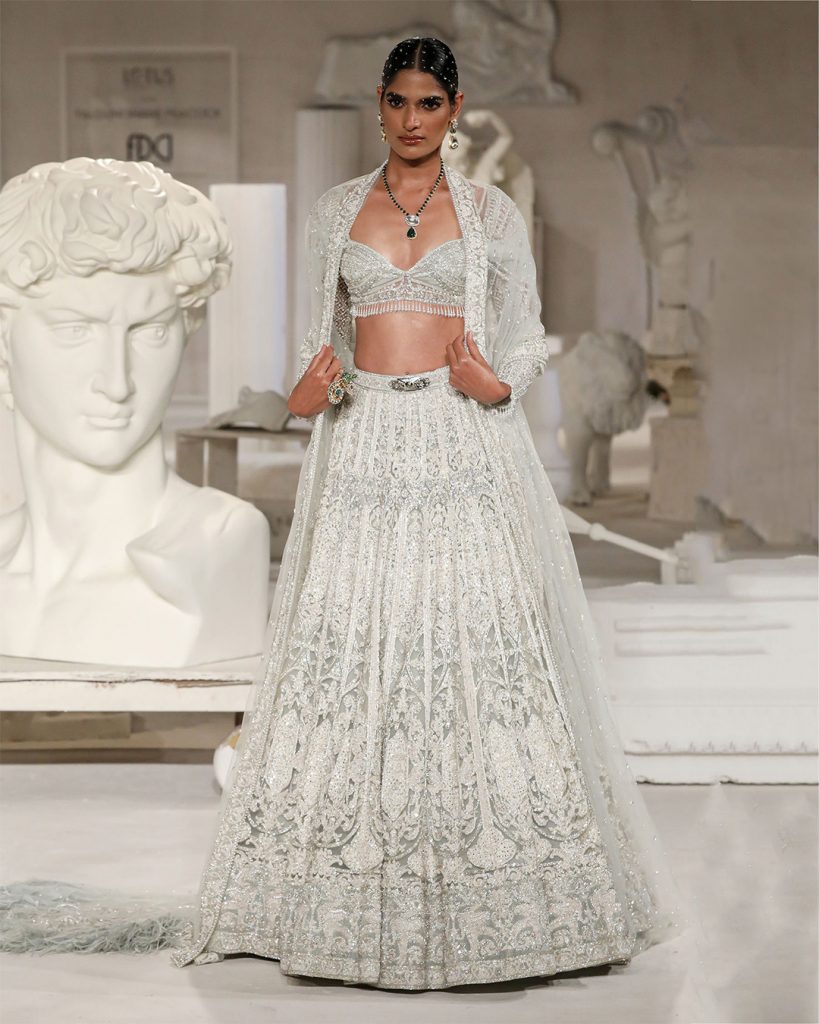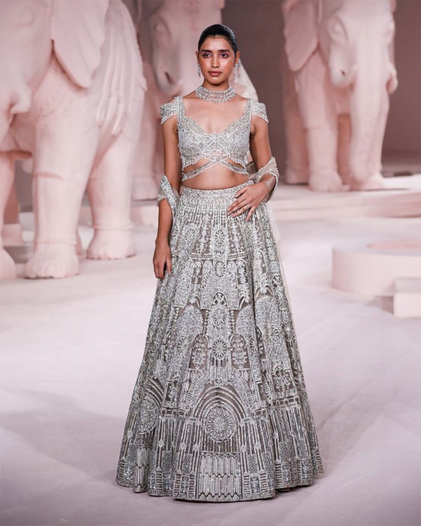 Another lightweight silver lehenga option is the Gabriella bridal lehenga set by Falguni Shane Peacock. The silver lehenga for wedding features foliage and architectural motifs in chrome applique and ivory threadwork details. The silver colour bridal lehenga is paired with a full-sleeved cropped blouse and a tulle dupatta for a cohesive look.