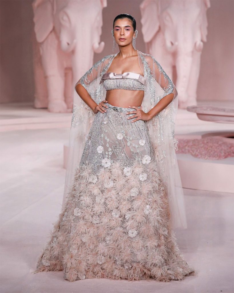 The Reggie bridal lehenga set from Falguni Shane Peacock’s India Couture Week collection is all about glamour and avant-garde aesthetics. The silver lehenga for wedding is replete with silver embroidery adorned with sequins, beads, stones, feather flowers and feather detailing. The lehenga skirt is paired with a bandeau top adorned with beads, sequins, a satin bow and a sequined tulle shrug.