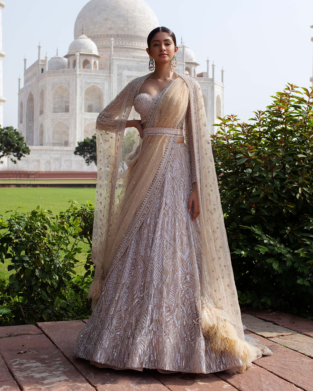 Wearing the same fabric creates a harmonious look and brings out the best in your latest bridal lehenga and sherwani combination. If you want to create a luxurious wedding look, silk is your ultimate fabric choice. If you want to explore a sturdy, lightweight fabric, georgette is the way to go. Other prominent options include brocade, chiffon, velvet, and tulle. Make sure you consider crucial factors such as the venue and the season in which the wedding will take place.