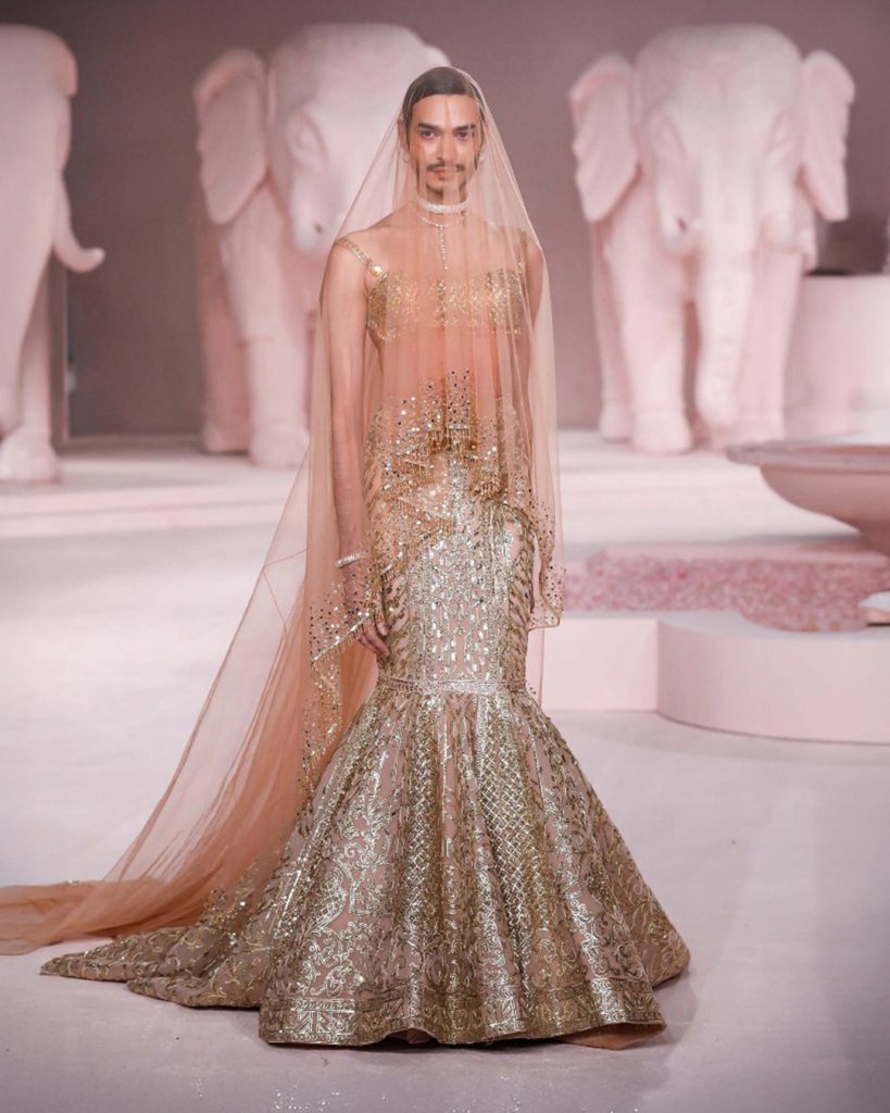 A peach-based mermaid-cut lehenga skirt replete with light-gold sequin and beadwork. The latest bridesmaid lehenga skirt is paired with a cropped embellished blouse with sequin and tassels and a tulle veil with tassel detailing.
