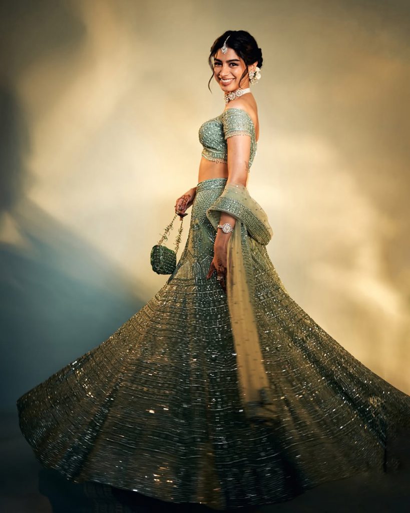 The tulle lehenga featured intricate motifs adorned with silver and aqua-green Swarovski crystals, imparting a glimmering look to the ensemble. The embellished lehenga skirt was paired with a cropped, off-shoulder blouse with similar embroidery and tassel detailing. The latest bridesmaid lehenga was styled with a matching tulle dupatta with an embellished border.