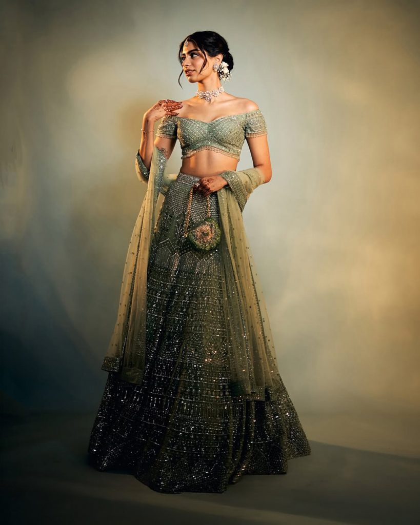 Khushi Kapoor served major bridesmaid goals at BFF Aaliyah Kashyap’s wedding. The starlet exuded timeless elegance, dressed in a bespoke Falguni Shane Peacock lehenga. Khushi opted for an off-shoulder, aqua green designer lehenga for bridesmaid with mirror and sequin work detailing to match the theme for bridesmaids.