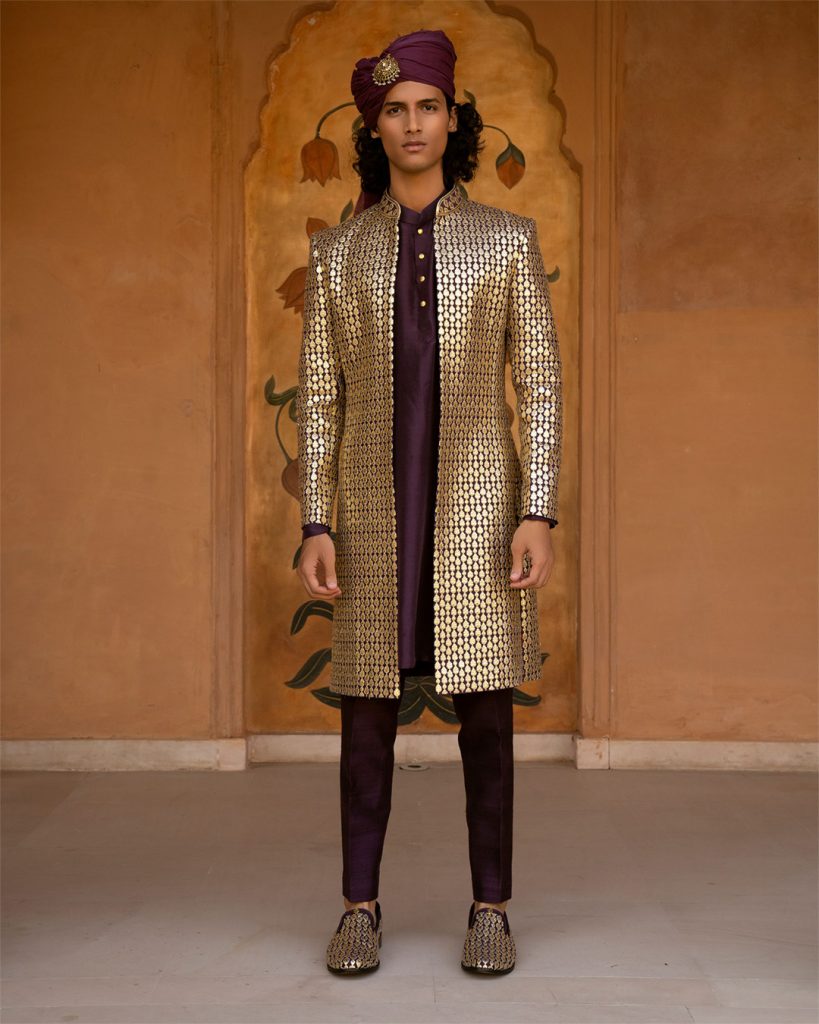 Purple-based, chrome-applique open sherwani design for men adorned with ethnic motifs, teamed with a silk kurta and trousers.