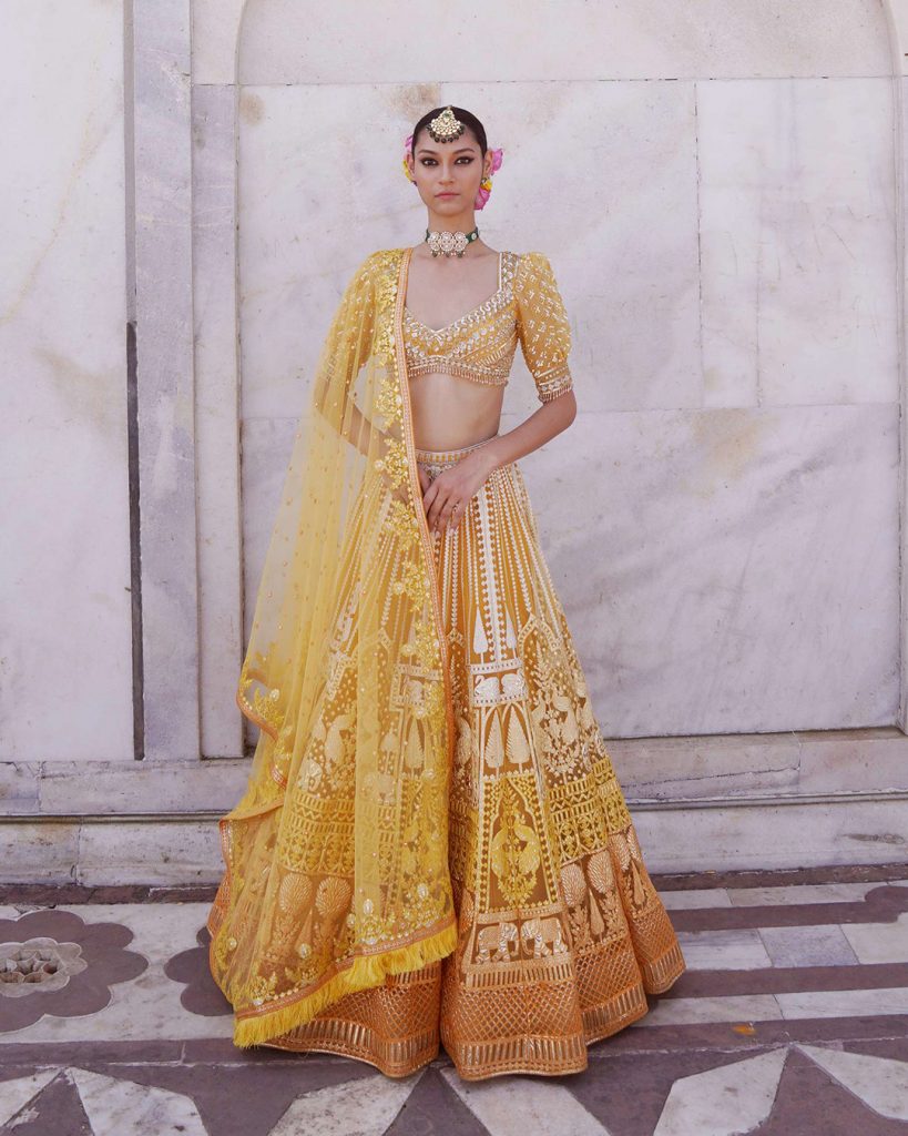 Lightweight lehengas made from airy fabrics such as chiffon, organza and georgette are most suitable for Haldi and Mehendi ceremonies. The lightweight fabrics allow for easy movement and breathability during these special events. Opt for minimal embroidery and embellishments to ensure that you are not overburdened by the weight of the lehenga and get to enjoy your special day to the fullest.