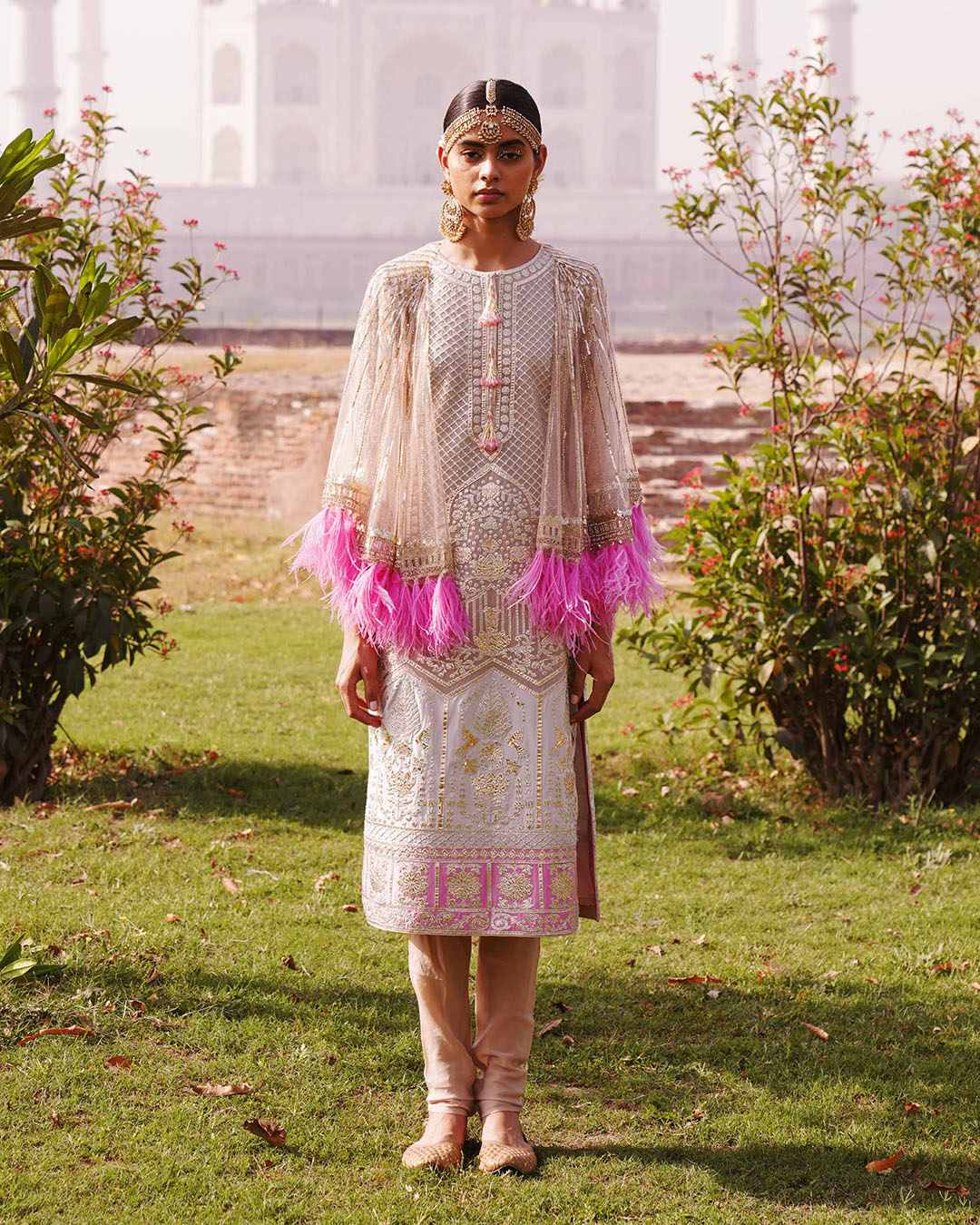Paradise pink-based designer kurta set for women features traditional motifs adorned with sequins, crystals and beads. The kurta is styled with a tulle cape, a paradise pink-feathered border and light pink raw silk pants.