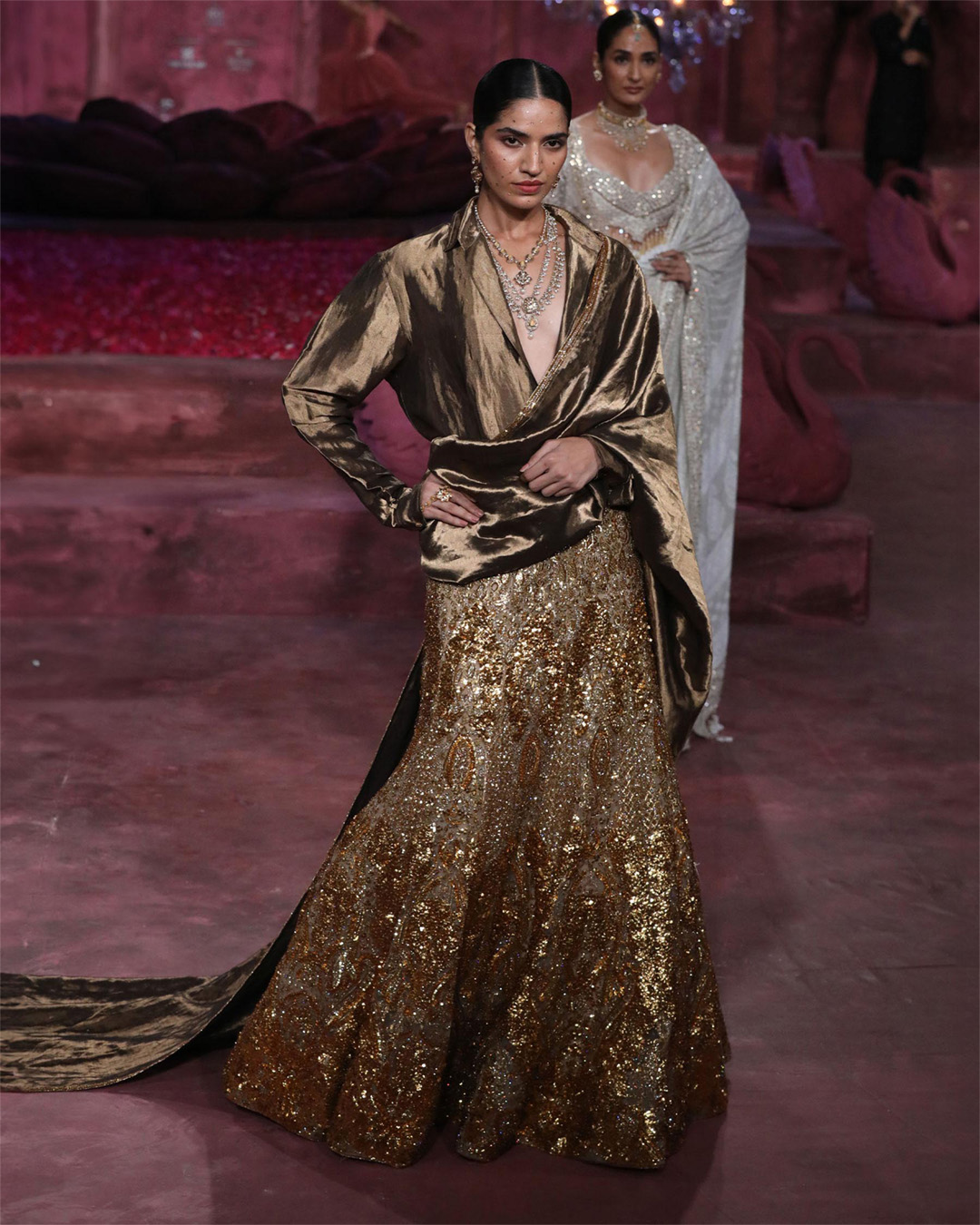The golden silk tissue lehenga is crafted from pure Banarasi Katan silk featuring elephant and swan motifs, with a hemline embellished with sequins, crystals and pearls. It is styled with a cropped blouse adorned with crystals, beads, pearls, sequins and beaded tassels along with a bordered tissue silk dupatta.
